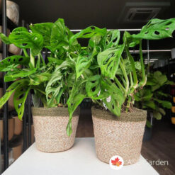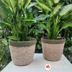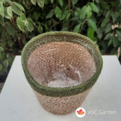 U ponudi je pletena ukrasna saksija za cveće. Saksija je bež nijanse sa zelenuim obodom. Može se u nju direktno stavljati biljka sa svojom rasadnom saksijom jer je obložena pa voda neće cureti van. Uklapa se u svaki prostor, može se koristiti za dekoracije i sobnih i baštenskih biljaka.
