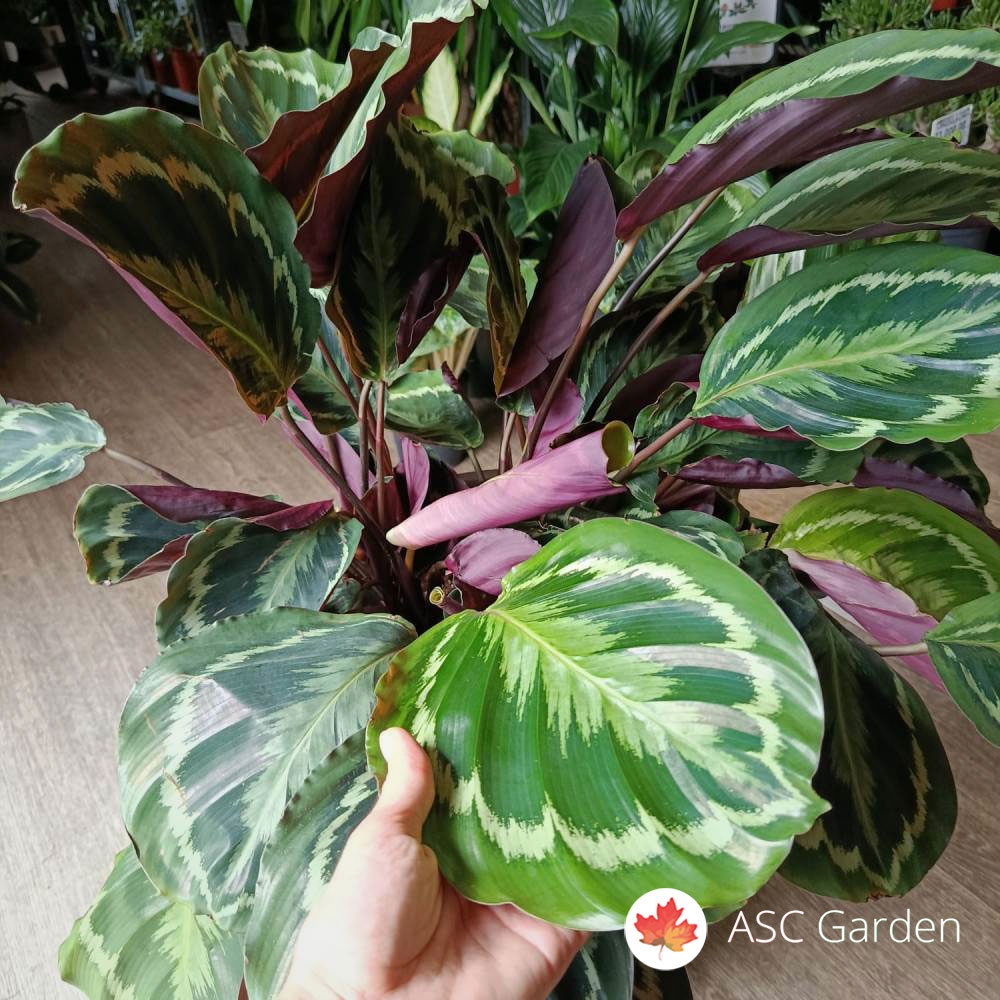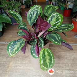 Calathea Medallion je prelepa sobna biljka poznata po svojim velikim listovima sa upečatljivim tamnozelenim, srebrnim i ljubičastim šarama. Sa visinom od 80 cm i saksijom prečnika 24 cm, ova biljka unosi egzotičnu eleganciju u svaki enterijer, bilo da se koristi za dekoraciju dnevnih soba, kancelarija ili spavaćih soba. Njena impresivna estetika čini je jednim od najpopularnijih izbora među ljubiteljima sobnih biljaka.