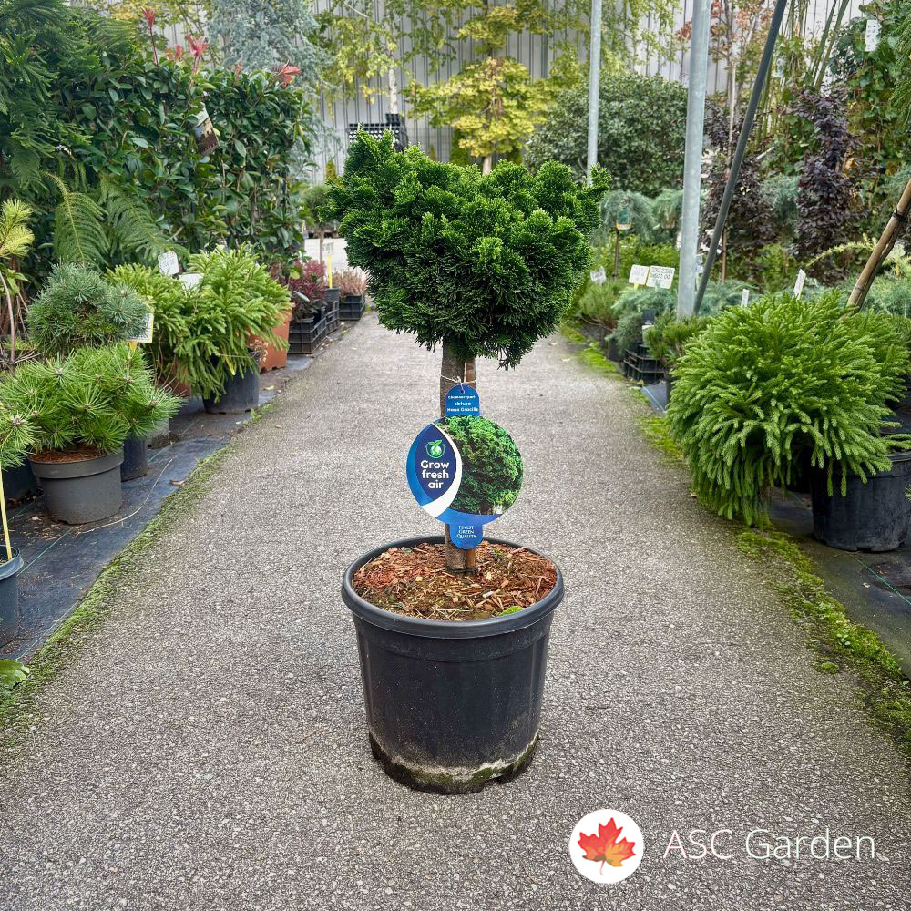 Chamaecyparis obtusa ‘Nana Gracilis’ na štapu predstavlja luksuznu formu jedne od najpoznatijih patuljastih četinara, prepoznatljivu po gustim, tamnozelenim i lepezastim granama koje formiraju bogatu i elegantnu krošnju. Postavljena na dekorativni štap, ova forma donosi savršen spoj prirodne lepote i rafiniranog oblika, čineći je idealnim izborom za reprezentativne vrtove, terase i luksuzne pejzažne kompozicije. Njena dugovečnost, spor rast i otmena forma čine je pravim draguljem među četinarima.