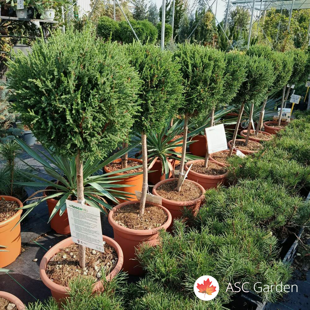 Cupressocyparis leylandii ‘Blue Jeans’ je elegantna zimzelena biljka formirana u prepoznatljiv oblik lopte na štapu. Sa svojom visinom od 70 cm u saksiji fi 26 cm, ovaj kultivar unosi urednost, stil i prefinjenu strukturu u svaki prostor. Guste, tamnozelene iglice odišu luksuzom i skladom, dok sama forma biljke naglašava eleganciju u pejzažnim i dekorativnim aranžmanima.