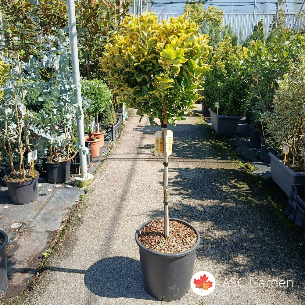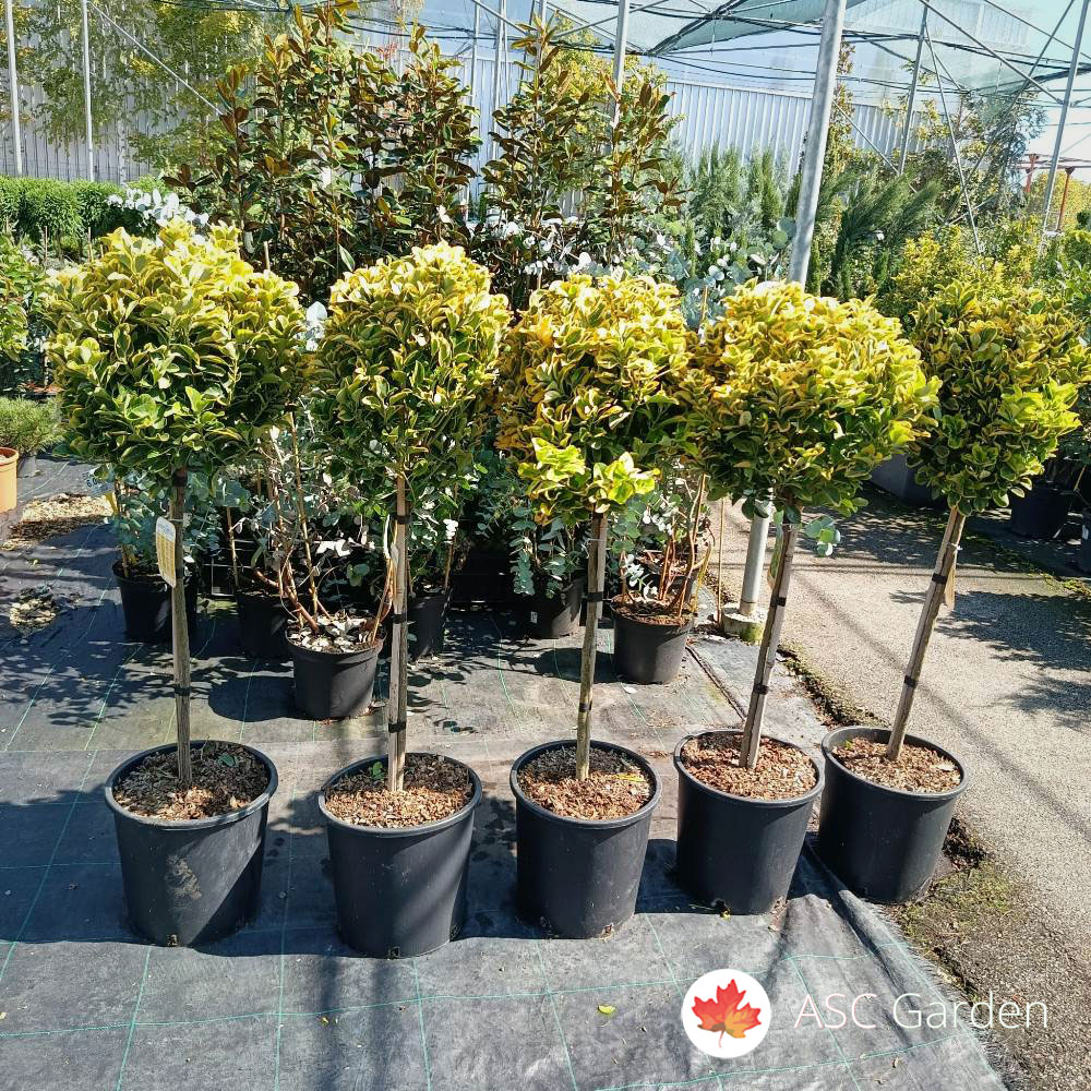 Euonymus japonicus ‘Elegantissima Aureus’ je elegantna i upečatljiva zimzelena biljka koja svojim zlatno-žutim i zelenim šarenim listovima unosi luksuz i svetlost u svaki prostor. Formiran u obliku lopte na stablu, ovaj primerak od 100 cm posebno je dekorativan i predstavlja savršen izbor za ljubitelje sofisticiranih biljnih aranžmana. Njegova atraktivna boja ostaje efektna tokom cele godine, čineći ga idealnim akcentom u vrtu, na terasi ili pri ulazima.