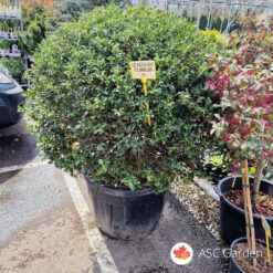 Ilex aquifolium ‘Alaska’, poznata i kao bodljikava božikovina, dolazi u formiranom obliku lopte i posađena je u prostranom kontejneru zapremine 180 litara. Sa visinom od 90–100 cm, ovo zimzeleno drvo odiše luksuzom i stabilnošću, pružajući snažan estetski pečat svakom vrtu, terasi ili ulaznom prostoru.