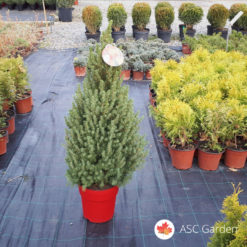 Patuljasta smrča – Picea glauca ‘Conica’ 90 cm je kompaktna zimzelena biljka koja se ističe svojim prekrasnim, konusnim oblikom i bogatim zelenim iglicama. Sa visinom od 90 cm, ova biljka je savršena za male prostore, kontejnere ili kao dekorativni element u vrtovima. ‘Conica’ se odlikuje gustim rastom, što je čini idealnom za formiranje niskih živih ograda ili kao akcenat u pejzažnim aranžmanima. Njene iglice ostaju atraktivne tokom cele godine, donoseći prirodnu lepotu i svežinu vašem prostoru.