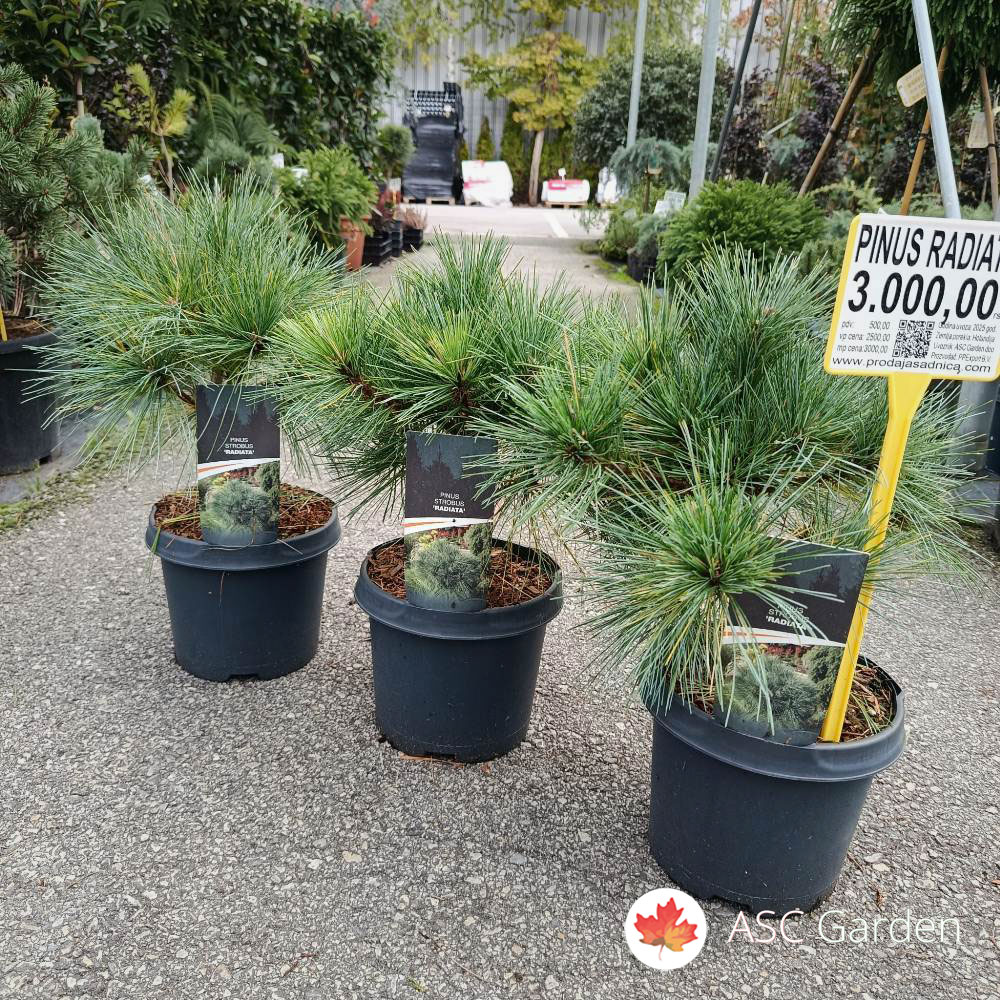 Pinus strobus ‘Radiata’ je prava umetnost prirode u malom formatu. Njegove elegantne iglice i kompaktan rast pružaju osećaj mira i harmonije, pa se savršeno uklapa u japanske bašte, minimalističke pejzaže i moderne eksterijere. Kao dugovečna biljka, idealan je izbor za one koji žele unikatnu i lako održivu zimzelenu dekoraciju.
